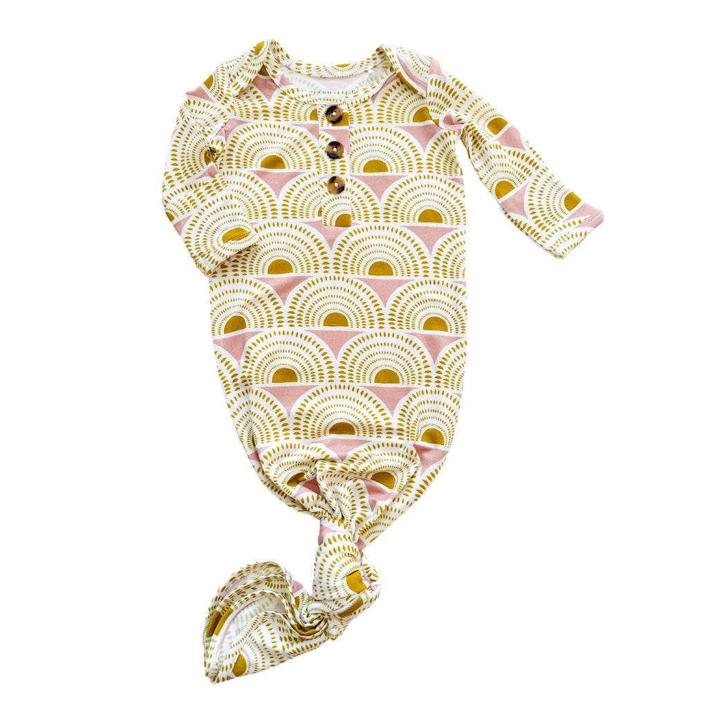 Our Vintage Sunshine knotted bamboo baby gown makes the perfect going home outfit or gift! Made from naturally soft and lightweight Bamboo viscose Material to keep your baby comfortable. Featuring fold over cuffs to keep baby from scratching and to keep their little hands warm. The knotted bottom can grow with your child and makes diaper changing a breeze!