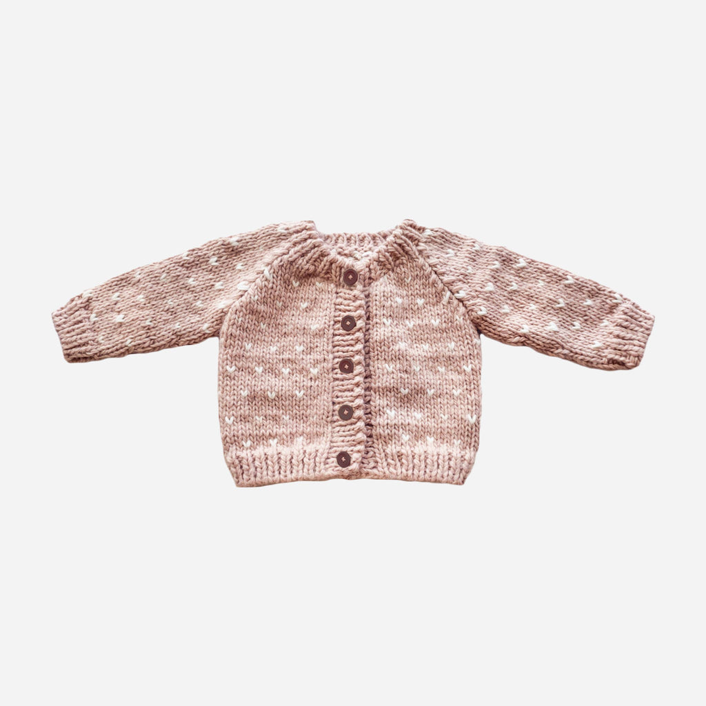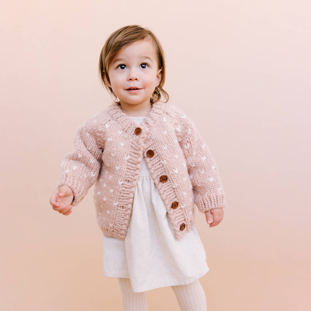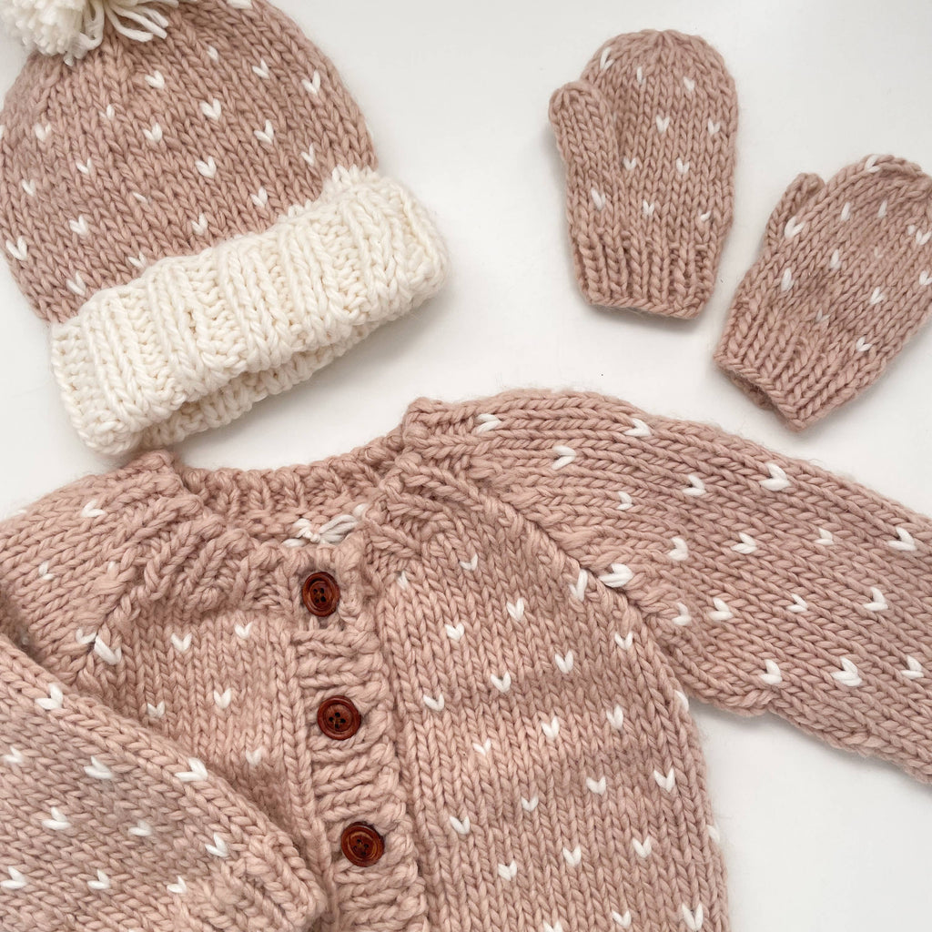 Featuring a gentle Blush base, this Cardigan's welcoming tiny Cream hearts will have your little one feeling like they're wrapped in your love. Don't forget the matching hat and mittens. Hand wash and lay flat to dry.