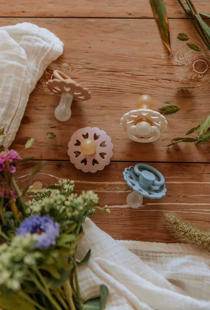 The FRIGG Fairytale rubber pacifiers are thoughtfully designed for your baby's comfort with natural latex and soothing properties. Each pacifier color draws inspiration from a timeless story by Danish author Hans Christian Andersen. The outward curve keeps the pacifier off delicate skin while features like air holes and a security handle ensure your baby's safety. Within the pacifier shield, air holes reveal eight little hearts that recreate Andersen's carved artwork motif and symbolize the universal language of love.