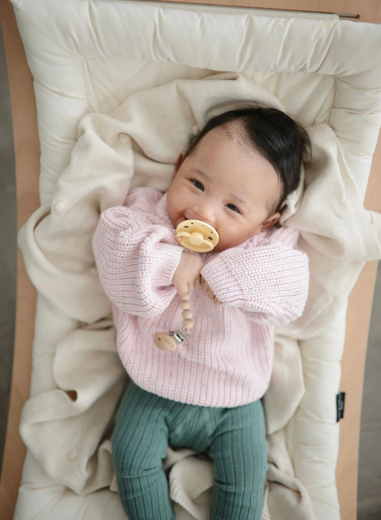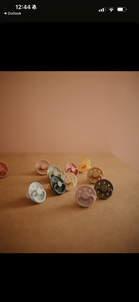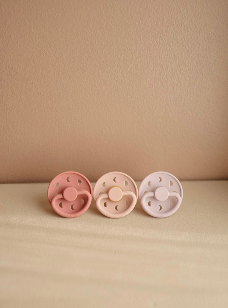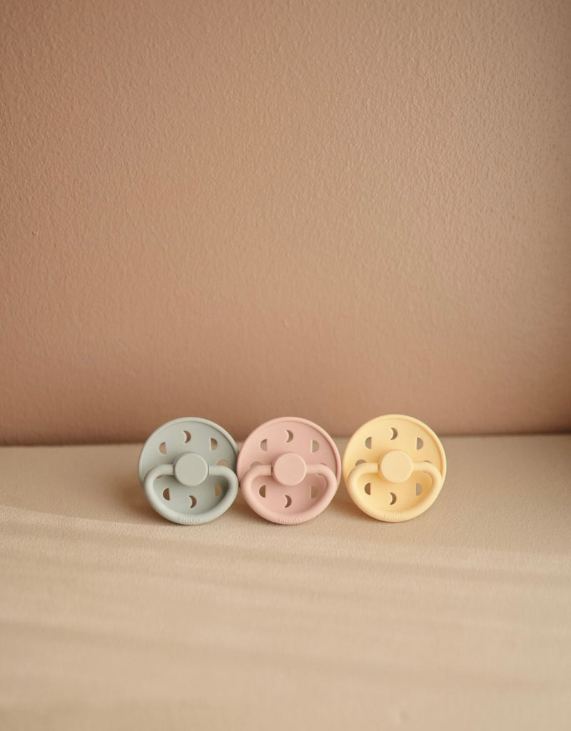 The FRIGG line of moon phase rubber pacifiers is thoughtfully designed for your baby's comfort and inspired by the moon in motion. The outward curve keeps the pacifier off delicate skin, while air holes and a security handle ensure your baby stays safe. Within the pacifier shield, air holes reveal the eight phases of the moon in subtle detail. Available in a range of soft colors, FRIGG pacifiers make a beautiful addition to your collection of baby essentials.